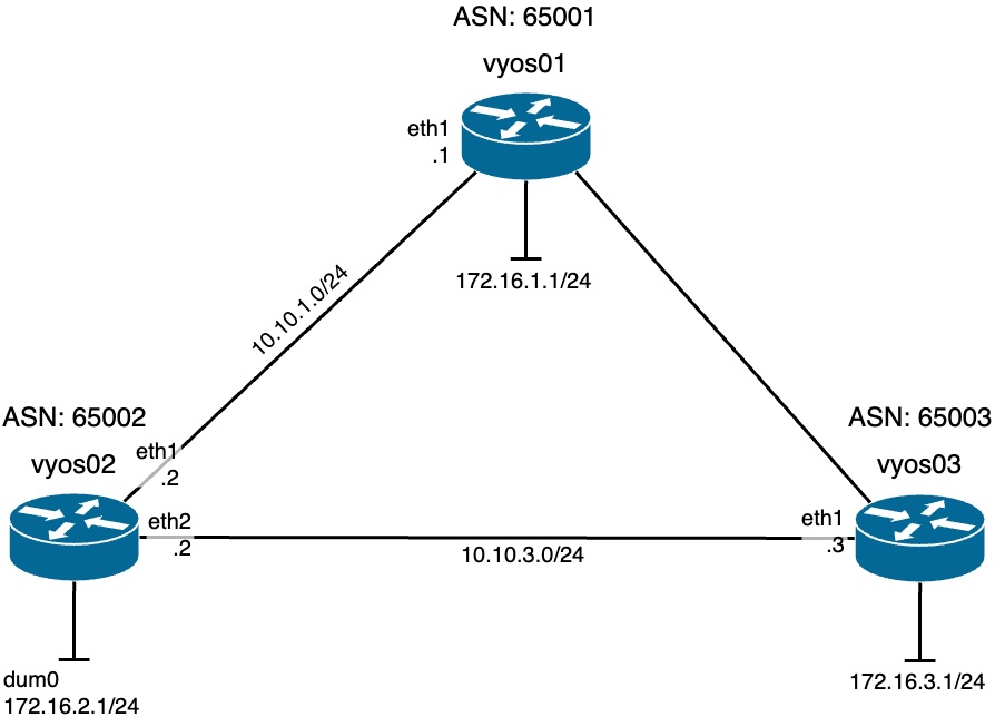 VyOS01とVyOS03はBGPピアとして接続され、経路制御を行っています。
